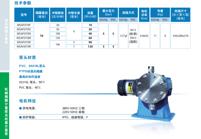 Seko Dosy系列機械隔膜計量泵,具有彈簧復位機械裝置和PPS外殼。內置雙凸輪結構,運行穩定無噪音,流量精準,馬達絕緣等級F,外殼材料耐酸堿腐蝕,具有優良的高溫抗蠕變性能;整泵的防護等級達到IP55。
